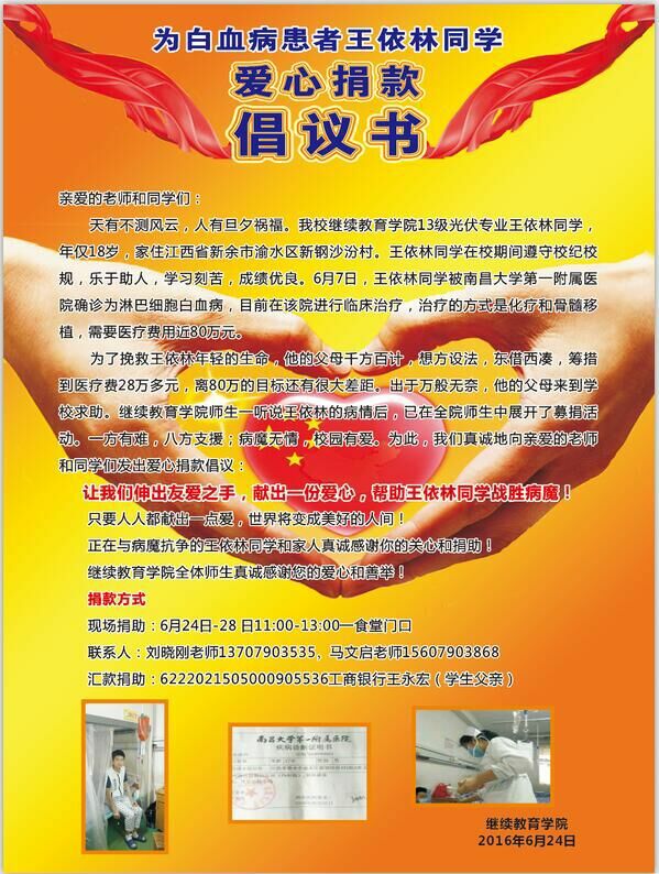 2016年6月初,继续教育学院13级王依林同学,不幸被医院诊断为“淋巴细胞白血病”。公司领导得知此消息后,及时向学校有关部门进行了汇报,积极组织师生开展捐款献爱心活动。院领导还专程到南昌大学一附院看望员工,鼓励他树立战胜疾病的信心,坚强乐观,并告知家长不要担心治疗费用的事情,我们会从多方渠道积极筹款,一方有难,八方来援。