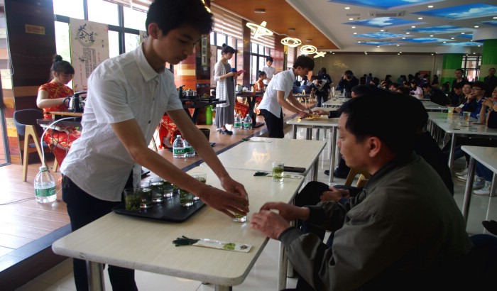 围绕“舌尖上的茶韵”主题,设计了二项活动。一项是4月8日11:30-12:30的茶艺展示、品味茶韵活动,校领导到现场参加活动;另一项是当日晚上举办的茶文化讲座活动,由高级茶艺师胡妍老师主讲,300余名员工聆听了讲座。