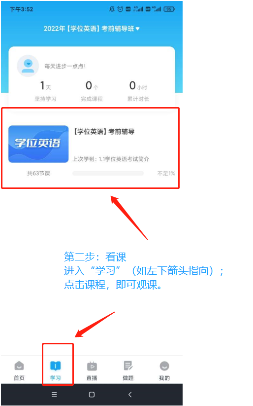 登录成功后,点击【学习】,选择已加入的班级【学士学位英语考前辅导】,选择相应视频进行学习。点击【做题】,可选择对应的真题或模拟试卷进行练习。