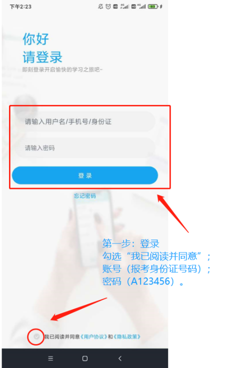 考生在报考且缴费成功24小时后,打开益考通APP,进入登录页面,输入益考通账号(报考的身份证号码)、密码(默认密码A123456)完成登录。
