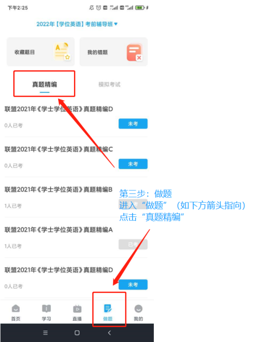 登录成功后,点击【学习】,选择已加入的班级【学士学位英语考前辅导】,选择相应视频进行学习。点击【做题】,可选择对应的真题或模拟试卷进行练习。